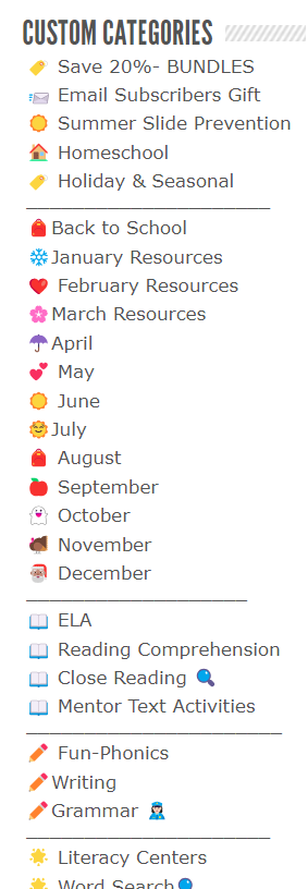 This is an example of what an optimized Custom Category section looks like. This is from Literacy Tales’s TpT page.
