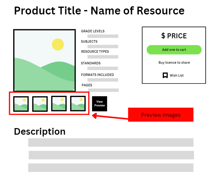 The majority of your cover image should be an image that either illustrates what type of resource it is, or is an image of the resource. (For example, if I have a Martin Luther King Jr worksheet, my main image could be of the worksheet, or an image of Dr. MLK, or both).