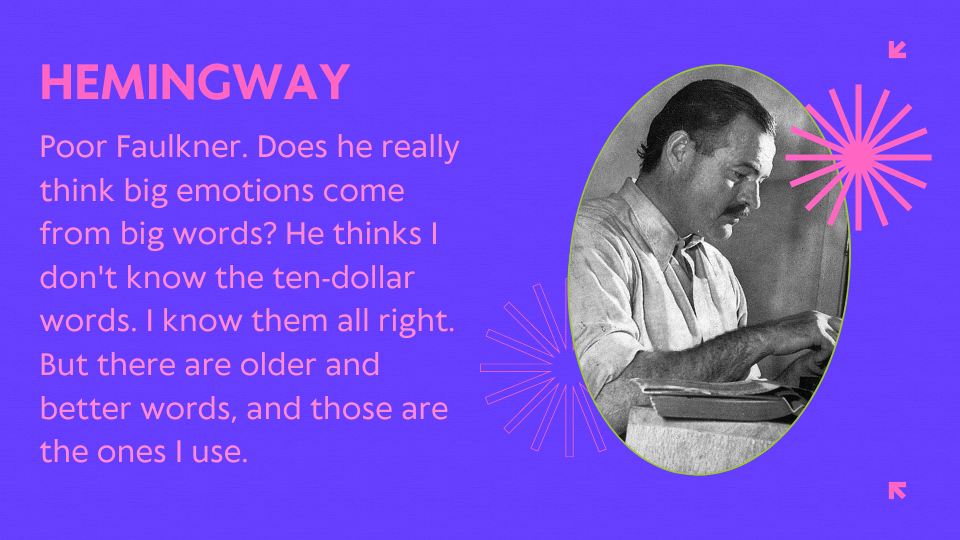Earnest Hemmingway famously criticized another writer, named Faulkner, for using big words, thinking they were being impressive. He said they weren’t, and that there are better words to use. Hemmingway famously wrote great stories that are short reads and full of easy-to-understand copy.